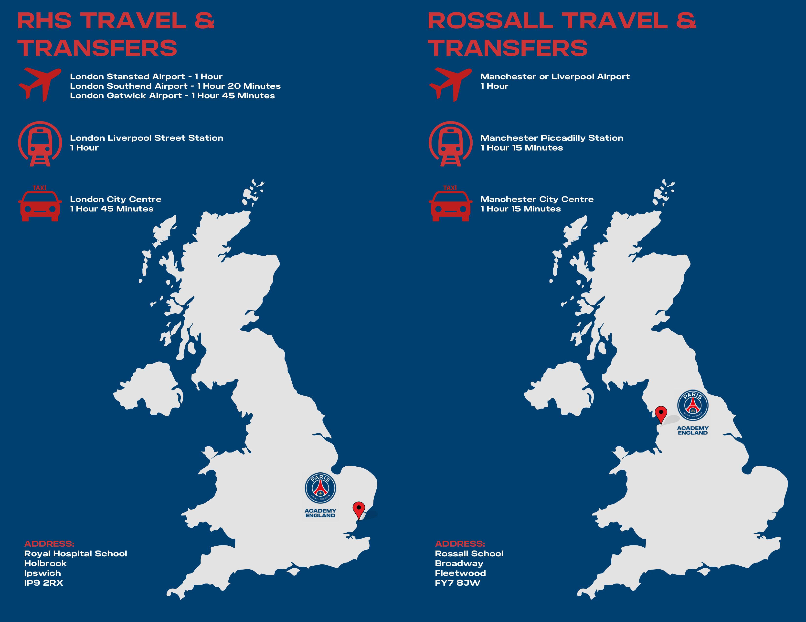 Mezinárodní rezidenční kempy umožní dětem z celého světa trénovat ve stylu PSG s trenéry s kvalifikací UEFA. Zároveň poznají anglickou kulturu, mohou si zvolit kombinaci intenzivní fotbalové akademie (40 hodin fotbalu týdně) nebo přibrat i intenzivní kurz angličtiny (20 x 45 min angličtiny týdně) – fotbal pak 25 hodin týdně. A mohou se potkat i s anglickými dětmi, kteří se účastní fotbalové akademie také.
