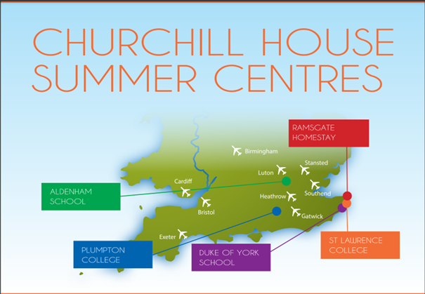 Churchill House Summer Centres nabízí letní kurzy v několika centrech. Program zahrnuje 15 hodin (20 vyučovacích hodin) výuky angličtiny ve skupinách po max. 15 studentech. V ceně jsou odpolední aktivity (sporty, kulturní aktivity, procházky, návštěvy muzeí), večerní aktivity (představení, diskotéky, kvízy), alespoň jeden půldenní a jeden celodenní výlet týdně. Školy také nabízejí volitelné výlety za příplatek. Škola zajistí letištní transfery za příplatek.