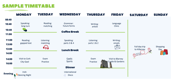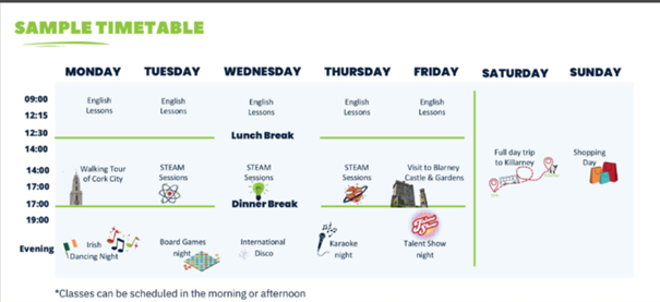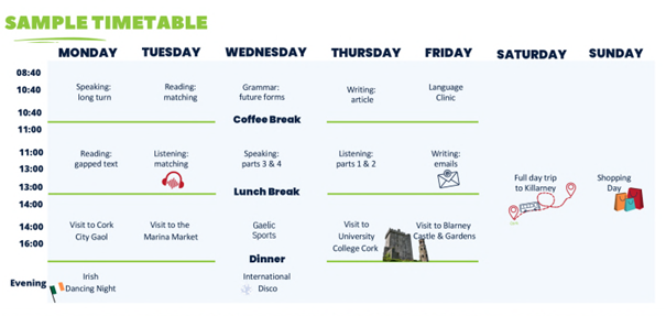 20 vyučovacích hodin angličtiny týdně plus 3 odpoledne týdně STEAM (Science * Technology * Engineering * Art * Maths), 2 odpoledne aktivit (procházka po Corku, návštěva Blarney Castle a zahrad), večerní aktivity (karaoke, bingo, diskotéka), ubytování v hostitelské rodině nebo rezidenční, aktivity, výlet.
