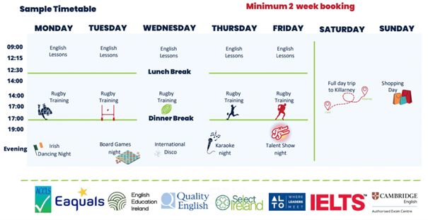 min 2 týdny, 20 vyučovacích hodin angličtiny (20 x 45 min) plus 5x odpoledne (cca 15 hodin týdně) rugby s trenéry Munster Rugby Club, ubytování se stravou – hostitelská rodina nebo školní rezidence, večerní aktivity, 1 celodenní výlet týdně.
