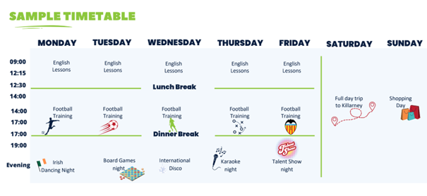min. 2 týdny, 20 vyučovacích hodin angličtiny plus 15 hodin fotbalu týdně (5 x týdně odpoledne), ubytování v hostitelské rodině nebo rezidenční se stravou, večerní aktivity (bingo, stolní hry, karaoke, irské tance), výlet . Fotbalové tréninky probíhají v angličtině pod vedením profesionálních trenérů Valencia C.F.