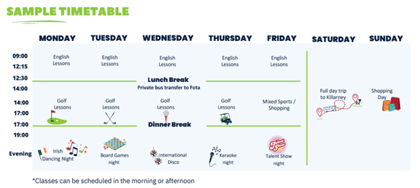 min 2 týdny, 20 vyučovacích hodin angličtiny (20x 45 min) + 4 odpoledne golfu s profesionálním trenérem ve FOTA ISLAND GOLF ACADEMY (4 odpoledne) – transfer na golfové hřiště soukromým autobusem, ubytování se stravou – hostitelská rodina nebo rezidence, večerní aktivity (bingo, stolní hry, diskotéka, karaoke, talent show), výlet (Killarney)…