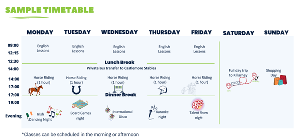 min 2 týdny, 20 vyučovacích hodin angličtiny (20×45 min) plus 5 hodin jízdy na koni za týden v Castlemore Stables, ubytování se stravou – hostitelská rodina nebo školní rezidence, večerní aktivity, 1 výlet