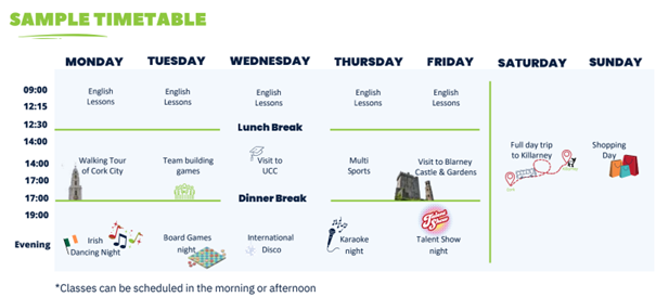 20 vyučovacích hodin týdně, min. 2 týdny, plná penze, hostitelské rodiny nebo rezidence, odpolední a večerní aktivity (pro studenty ubytované v rodinách: 2 odpoledne týdně odpolední aktivity mimo areál školy, 2 odpoledne týdně aktivity v areálu školy, 2 večerní aktivity týdně, pro studenty ubytované ve školní rezidenci aktivity každé odpoledne a večer), 1 celodenní výlet