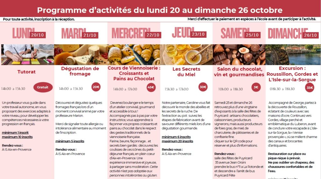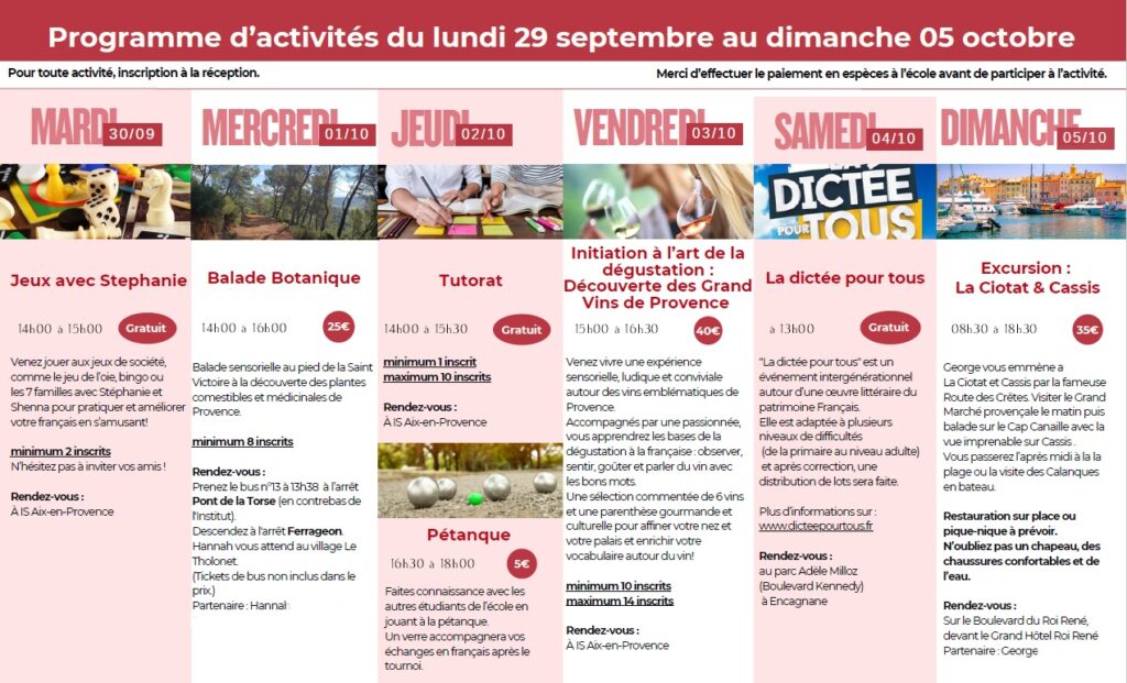 Kurz francouzštiny v dopoledních hodinách plus odpoledne v miniskupině kultura a společnost, fonetika a výslovnost, výuka v terénu, hry a písničky, ústní i psaný projev. 30 vyuč. hodin týdně, dopoledne skupiny po 5-10, odpoledne 3-6 studentů ve skupině.